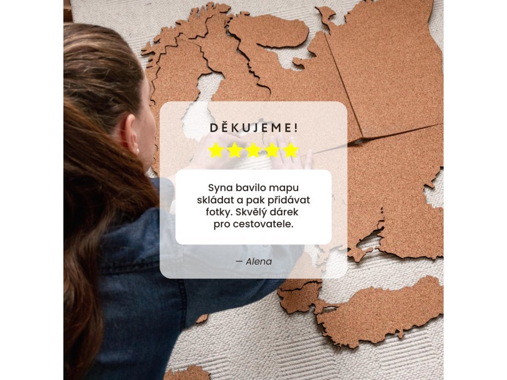 Zvěčněte své cestovatelské vzpomínky stylově – s naší samolepicí korkovou mapou světa proměníte každý interiér v osobní výstavu zážitků.